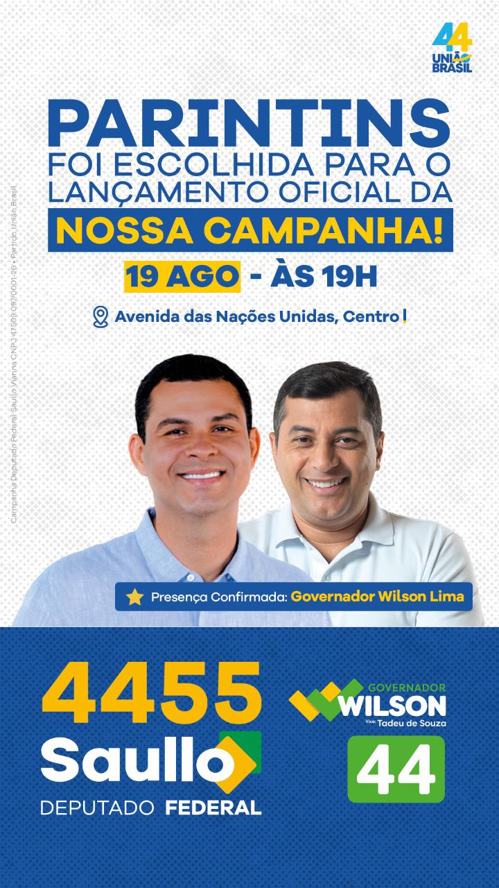 O evento será realizado na Av. Nações Unidas, Centro, em frente ao Bumbódromo, as 19h, e deverá levar uma multidão de apoiadores para o local. Saullo tem ligação afetiva com o município, e no dia 15 de julho recebeu o Título de Cidadão Parintinense, pelos relevantes serviços prestados à população.