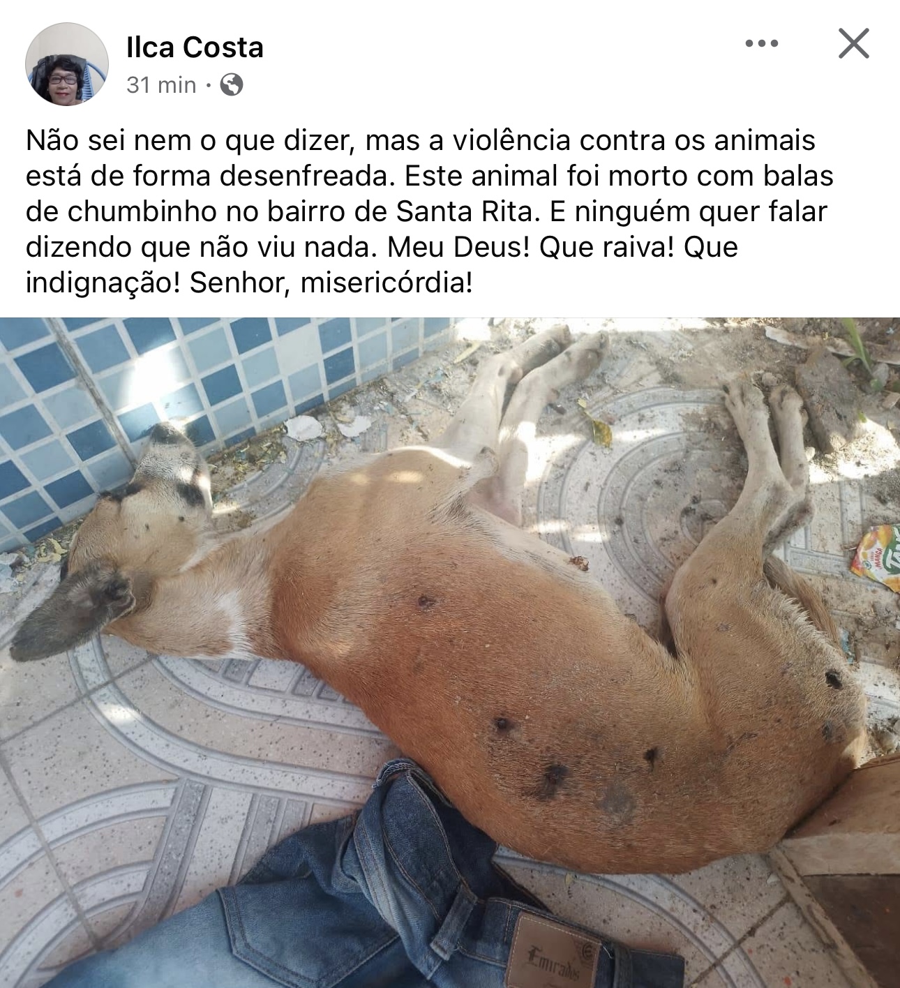 A denúncia foi feita pela professora Ilca Costa, que lamentou a violência contra animais na cidade. “Este animal foi morto com balas de chumbinho no bairro Santa Rita. E ninguém quer falar dizendo que não viu nada. Meu Deus! Que raiva! Que indignação! Senhor, misericórdia!”, desabafou.