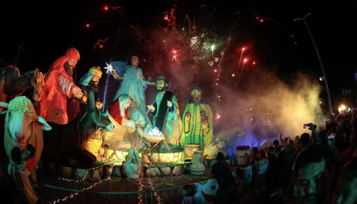 O presépio, que tem Reis Magos, Maria de Nazaré, Estrela-Guia, Sagrada Família e anjo, totalizando 19 bonecos que fazem o movimento ao redor do Menino Jesus com dimensão de boca de cena de 35 metros e 15 metros de altura.
