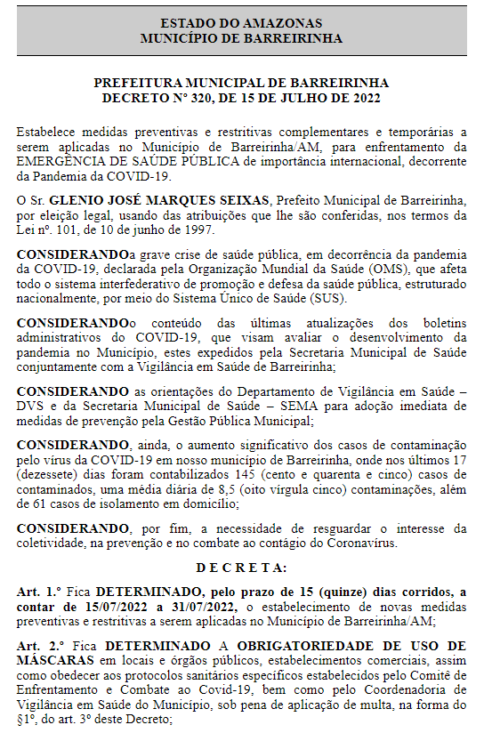 Manaus (AM) - O município de Barreinha, a 330 km de Manaus, decretou o uso obrigatório de máscaras por 15 dias, entre 15 a 31 de julho, em ambientes fechados no município.