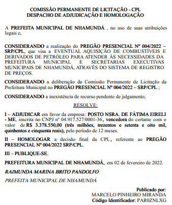 Conforme documentos firmados pela prefeita de Nhamundá, Raimunda Marina Brito Pandolfo, os custos de combustíveis e derivados de petróleo vão atingir R$ 3.378.550,00, a serem faturados pela empresa Posto Nossa Senhora de Fátima – Eireli, que venceu todos os 20 itens da licitação.
