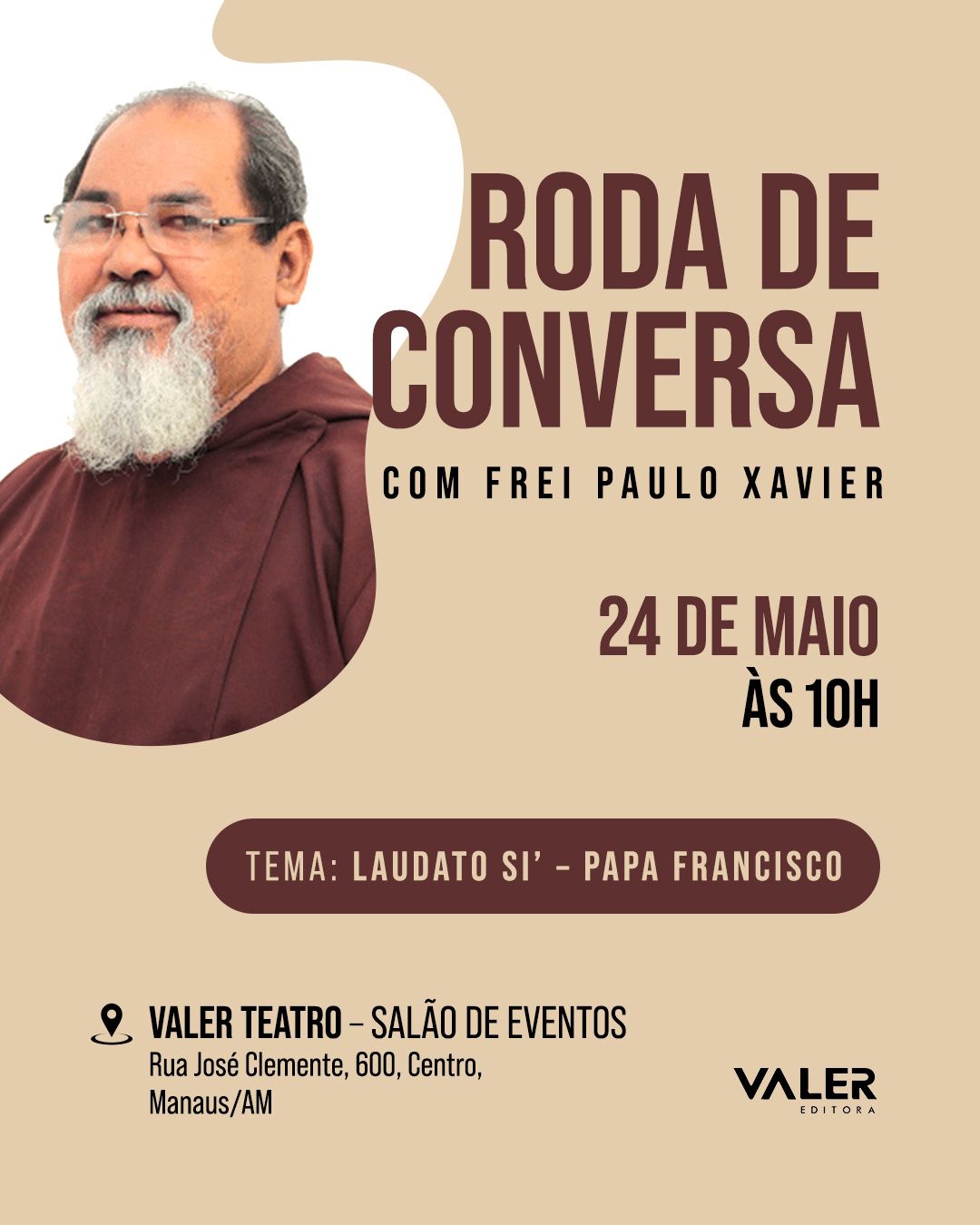 A encíclica 'Laudato Si', um documento elaborado pelo Papa Francisco que aborda a importância, o cuidado e a necessidade de se preservar o meio ambiente para as próximas gerações, será o tema da Roda de Conversa COP 30, promovida pela Editora Valer, no dia 24 de maio, às 10 h, no salão de eventos da Valer Teatro, com o Frei Paulo Xavier. A entrada é gratuita.