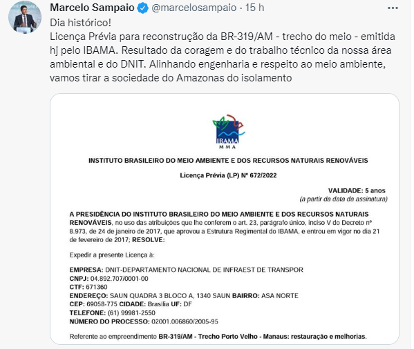 "Resultado da coragem e do trabalho técnico da nossa área ambiental e do DNIT. Alinhando engenharia e respeito ao meio ambiente, vamos tirar a sociedade do Amazonas do isolamento", disse o ministro na publicação.