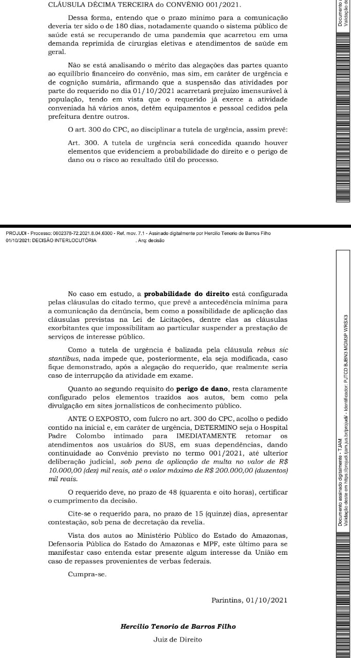 Parintins/AM - A justiça determinou ao Hospital Padre Colombo que retome imediatamente os atendimentos aos usuários do SUS. A decisão é do juiz Hercílio Tenório de Barros Filho, juiz de direito da Comarca de Parintins em decisão proferida nesta sexta-feira, durante o plantão judiciário.