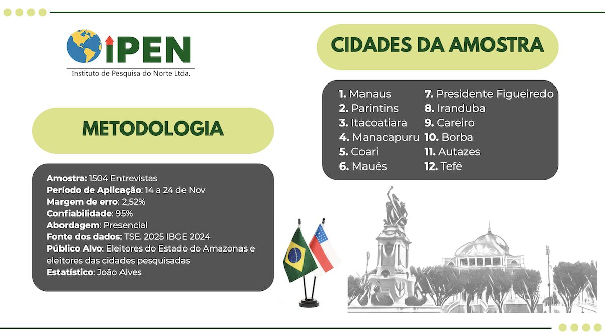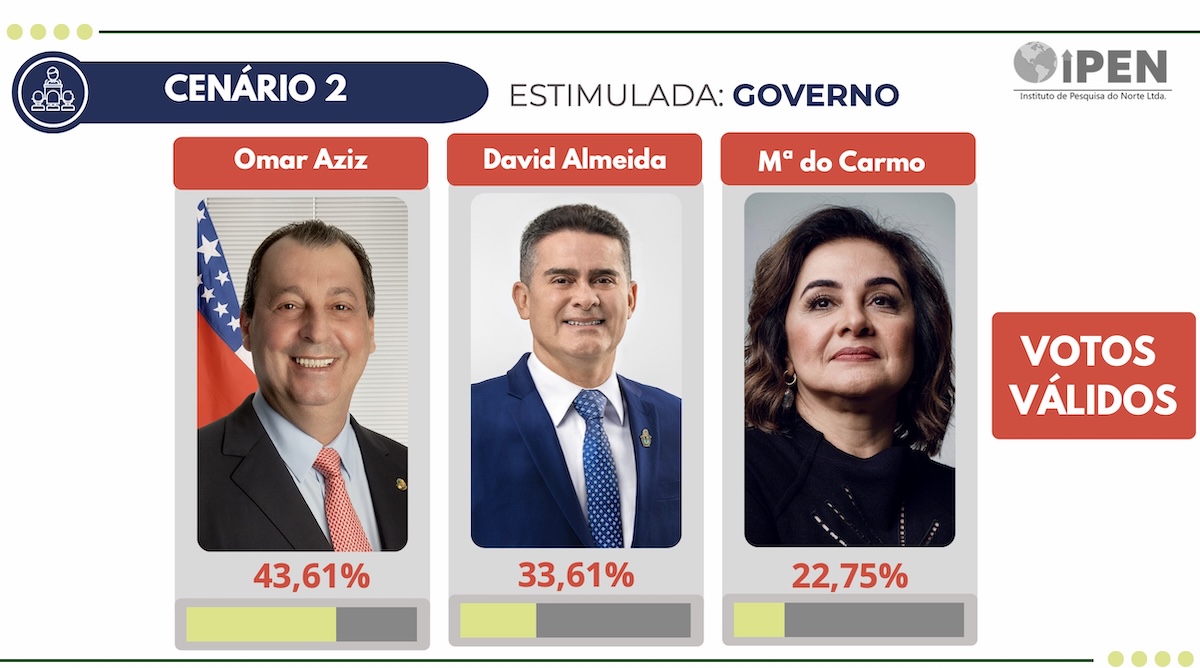 O estudo, realizado pelo Instituto de Pesquisa do Norte (Ipen), a pedido do consórcio G6 — formado por BNC Amazonas, Amazonas Atual, Portal Único, Portal do Marcos Santos, Portal do Mário Adolfo e Blog do Hiel Levy — analisou três quadros eleitorais diferentes, considerando possíveis arranjos envolvendo David Almeida (Avante), Tadeu de Souza (Avante) e Maria do Carmo (PL).