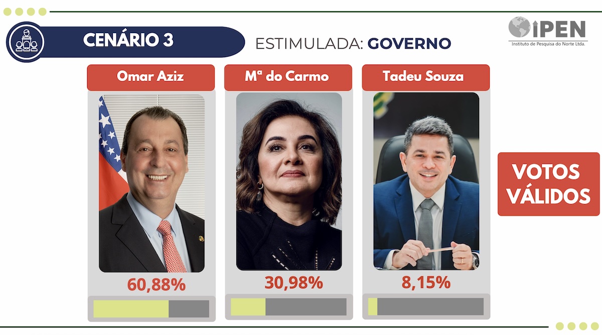 Quando o prefeito de Manaus é retirado da disputa, Omar Aziz dispara, alcançando quase 60%. Maria do Carmo aparece em segundo lugar e Tadeu soma pouco mais de 8%.