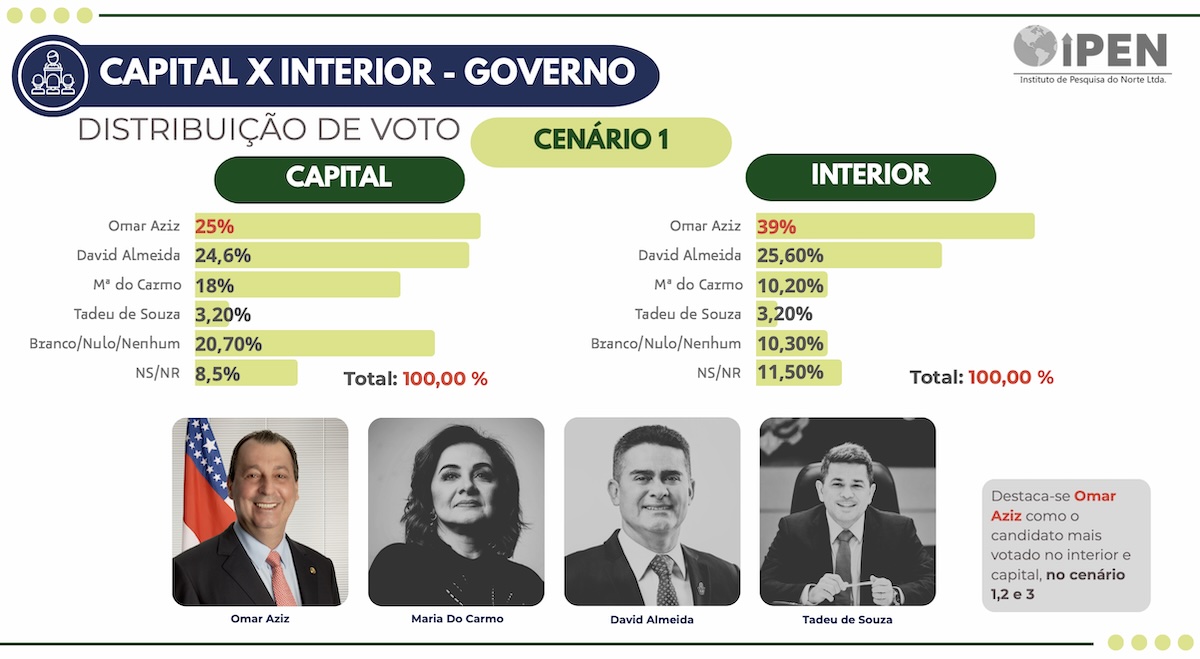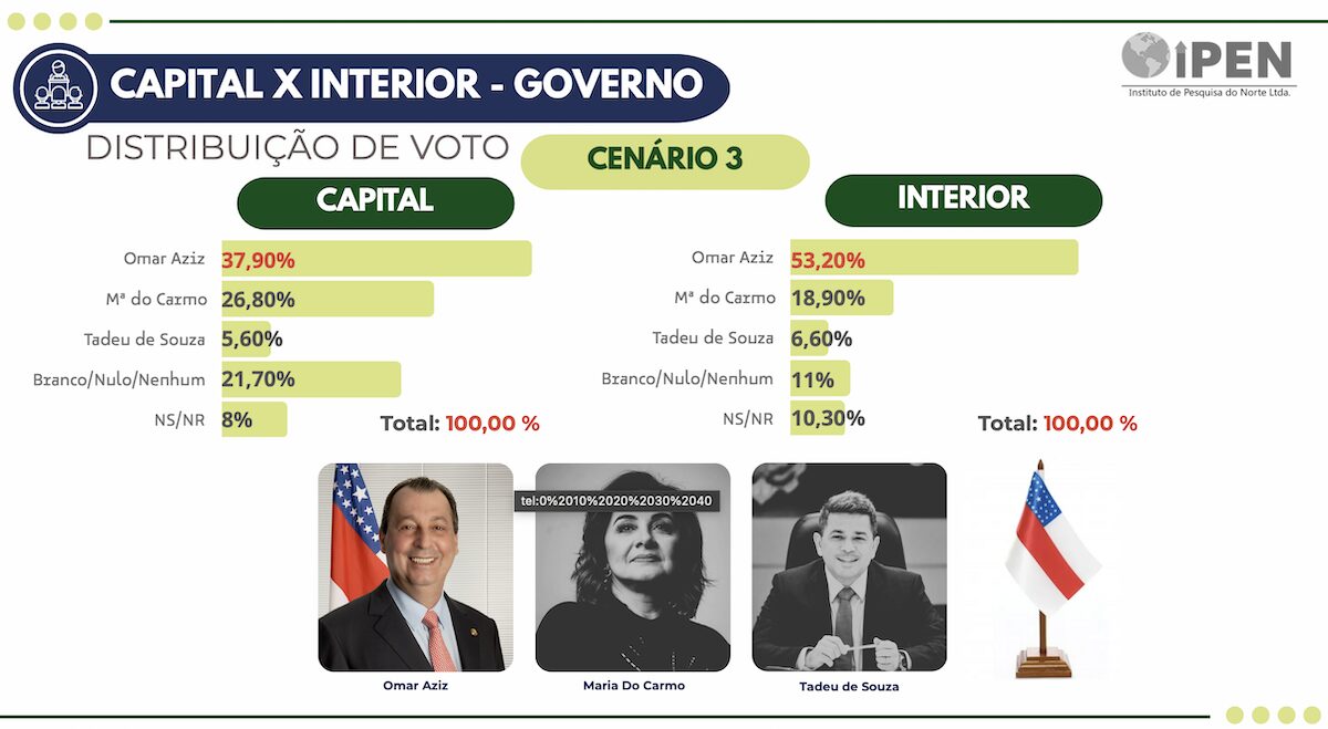 O cruzamento dos dados revela uma disputa acirrada entre Omar e David na capital. Em Manaus, Aziz vence por apenas 0,4 ponto: 25% contra 24,6%. Maria do Carmo aparece com 18%, e Tadeu soma 3,20%. No interior, Omar abre distância expressiva, ampliando sua vantagem sobre o prefeito.