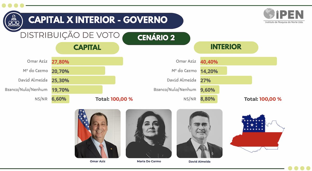 A pesquisa reafirma a força eleitoral de Aziz nos municípios: sua vantagem sobre David supera 13 pontos percentuais. O interior foi decisivo em outras eleições, como em 2022, quando garantiu sua reeleição ao Senado mesmo após derrota expressiva em Manaus.