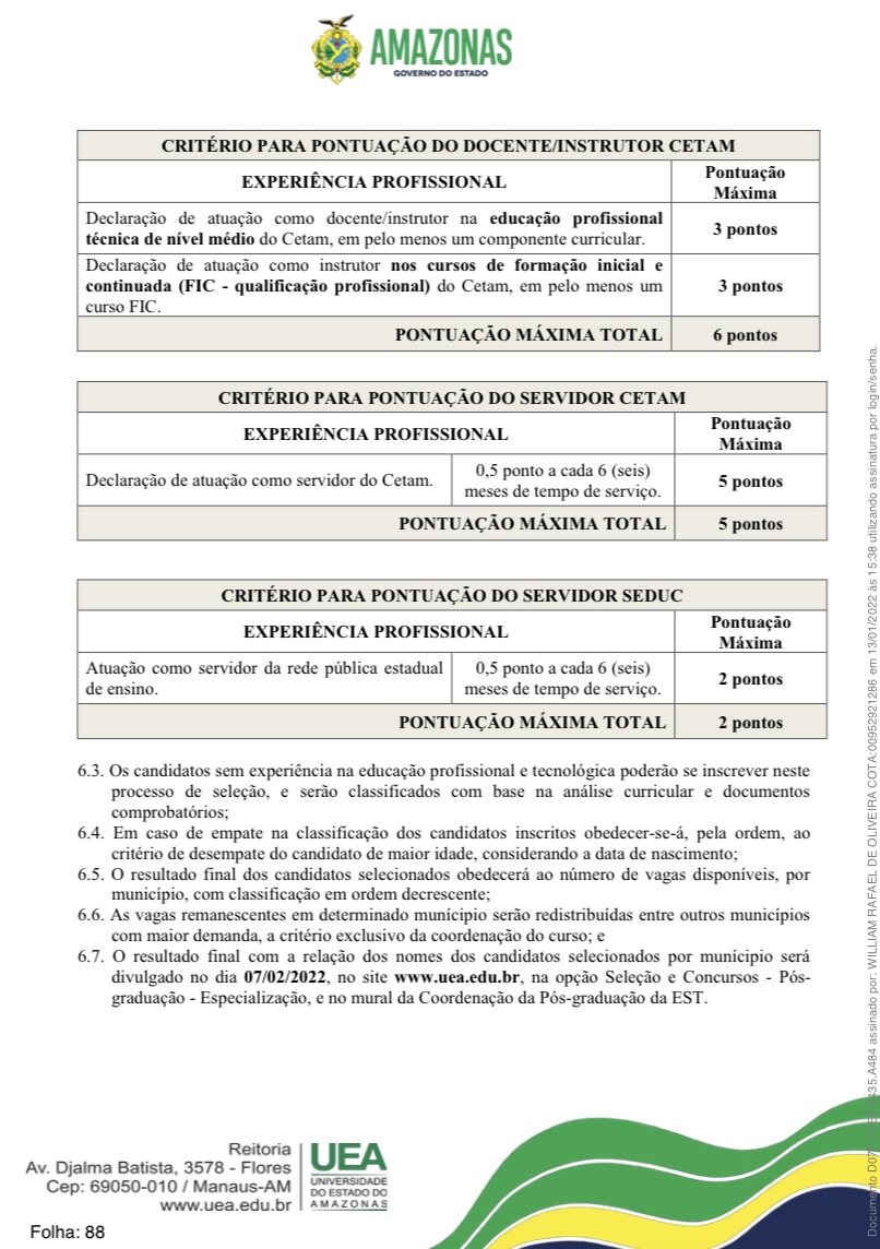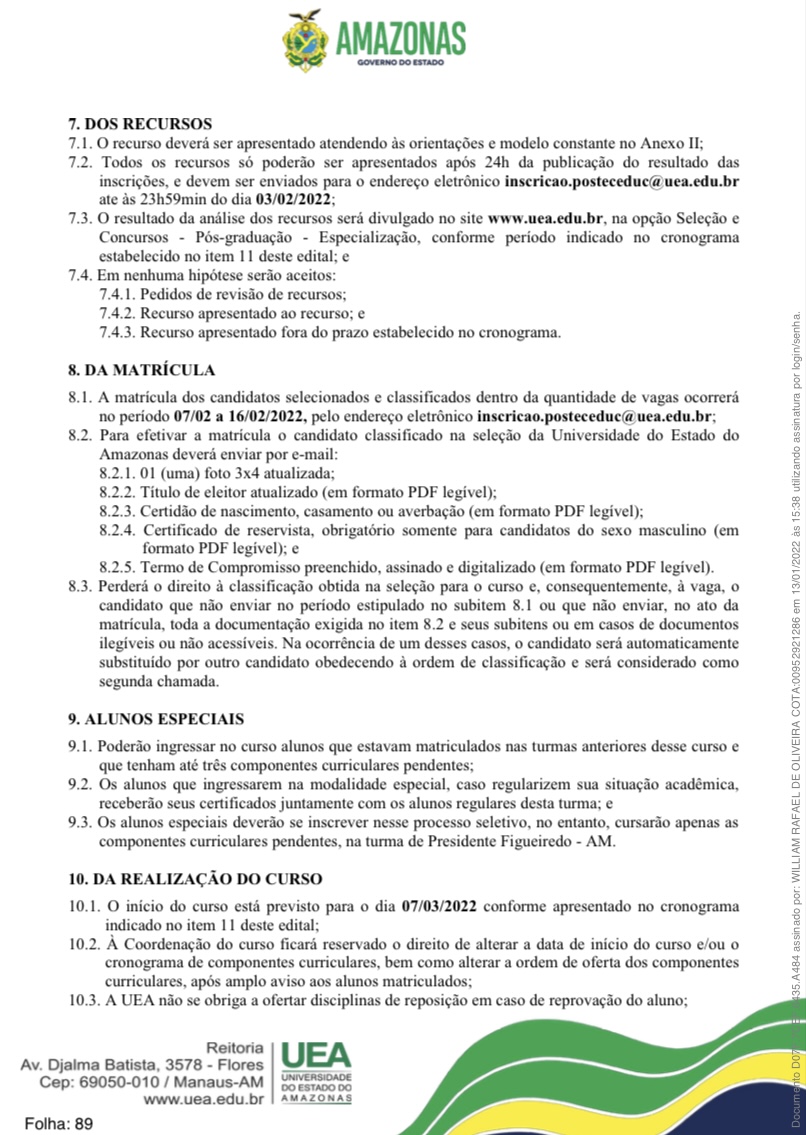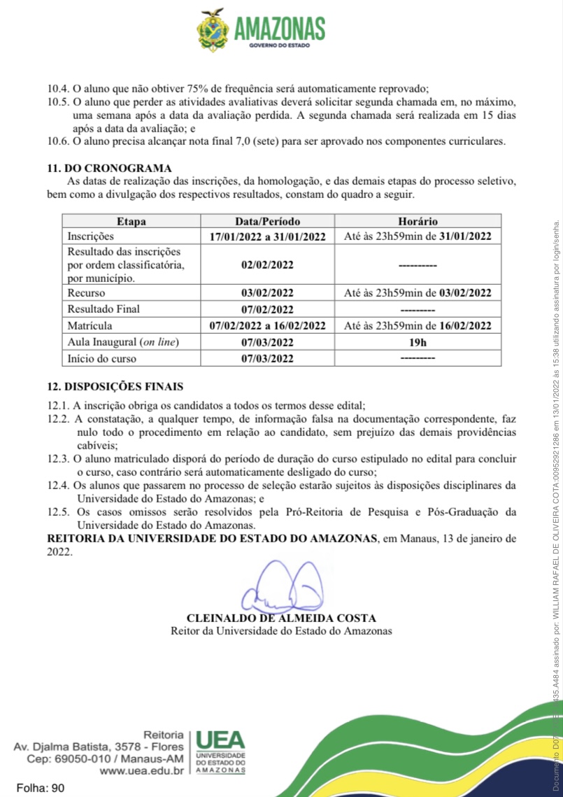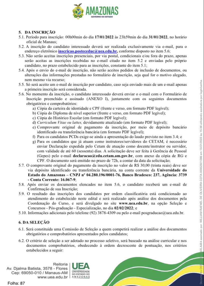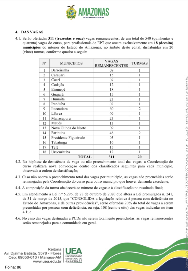 Para o município de Parintins, foram disponibilizadas 48 vagas. As inscrições dos candidatos interessados deverão ser realizadas exclusivamente via e-mail, para o endereço eletrônico [email protected], das 00h00do dia 17/01/2022 às 23h59min do dia 31/01/2022, no horário oficial de Manaus. A taxa de inscrição será no valor de R$ 30,00.