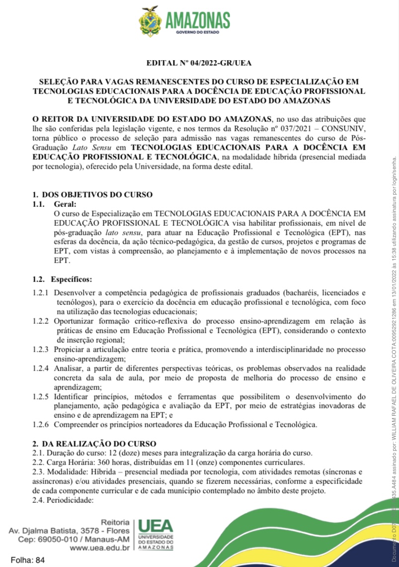 Parintins/AM - A Universidade do Estado do Amazonas (UEA), publicou na última quinta-feira (13), um novo edital com vagas remanescentes do curso de Pós-graduação em “Tecnologias Educacionais para a Docência em Educação Profissional e Tecnológica”, na modalidade híbrida (presencial mediada por tecnologia). O curso será realizado em parceria com o Centro Tecnológico do Amazonas (Cetam), com duração de 12 meses.