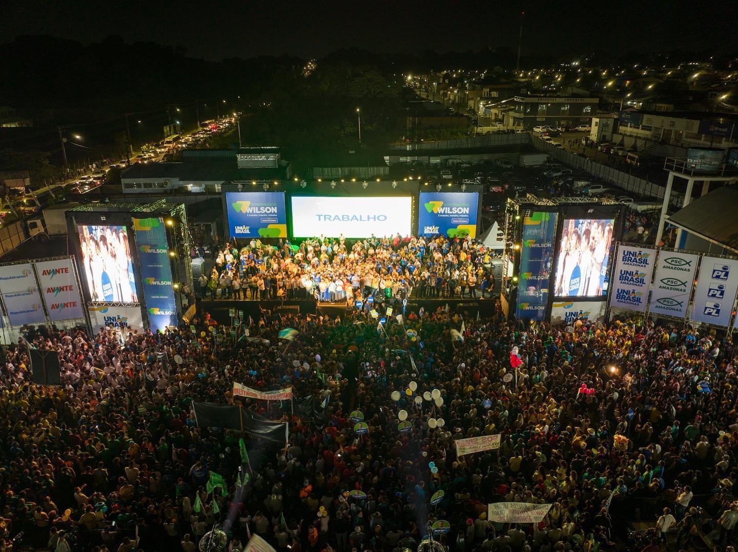 Manaus (AM) - Com o apoio de nove partidos, o União Brasil formalizou na noite desta quinta-feira (4) candidatura à reeleição do governador Wilson Lima. De acordo com os organizadores da convenção, mais de 30 mil pessoas estiveram no lançamento.