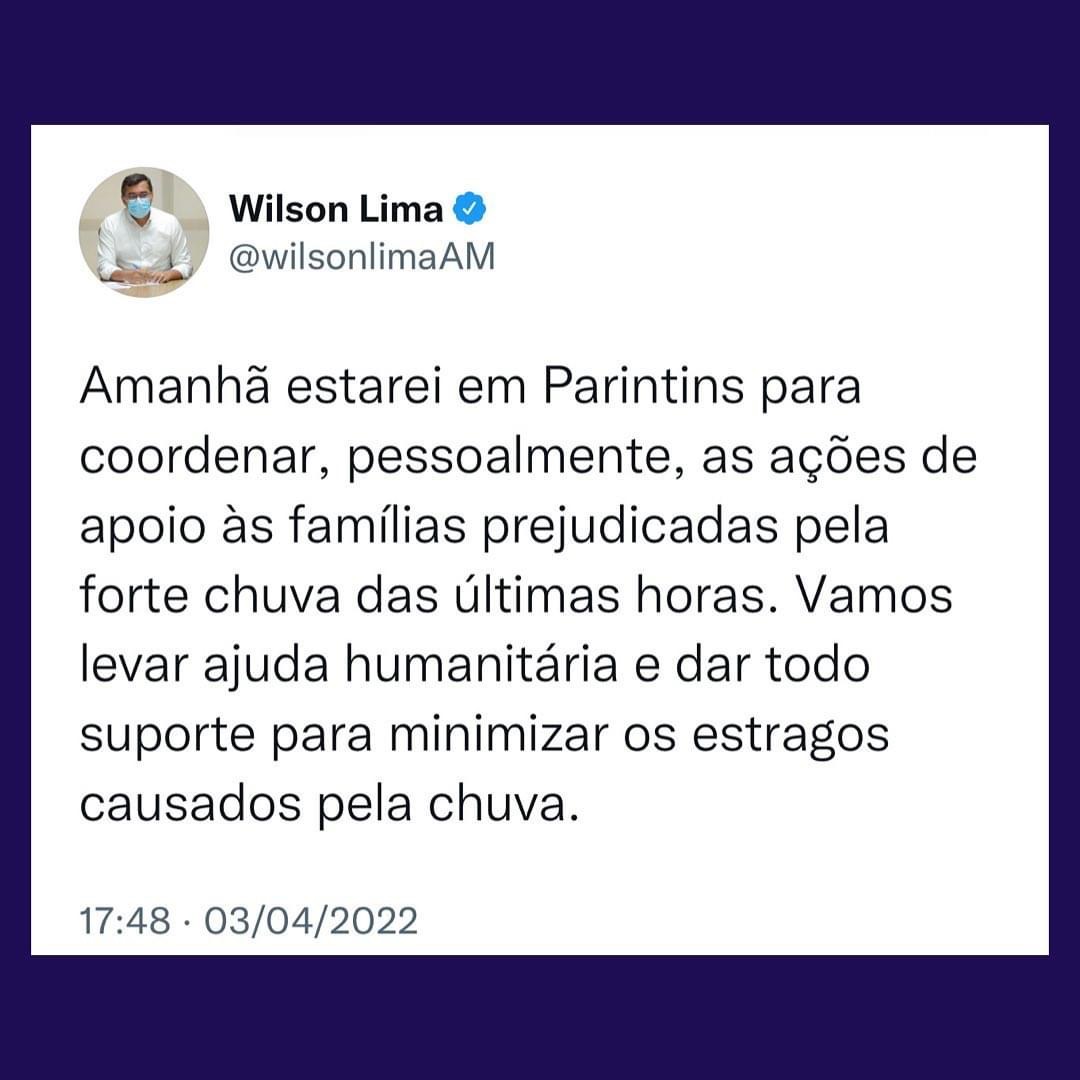 “Amanhã estarei em Parintins para coordenar, pessoalmente, as ações de apoio às famílias prejudicadas pela forte chuva das últimas horas. Vamos levar ajuda humanitária e dar todo suporte para minimizar os estragos causados pela chuva”, publicou o governador.